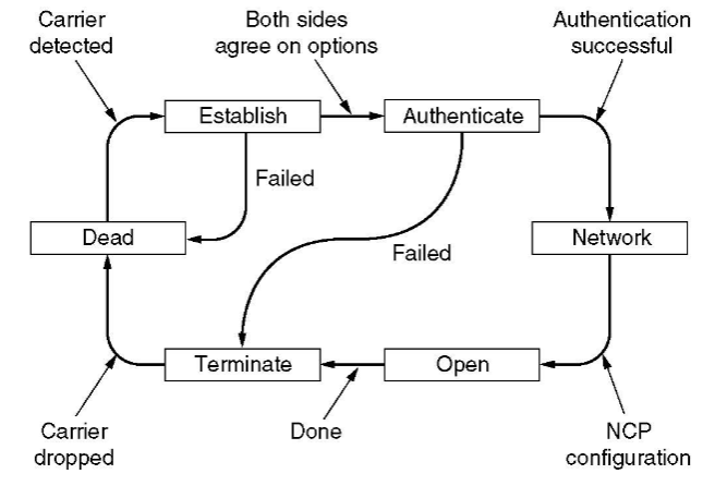 The Life-cycle of Point-to-Point Protocol takes the following steps: